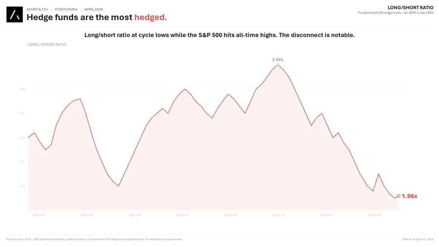 What makes this even more interesting is positioning. Hedge funds remain defensive, with the long/short ratio sitting at 1.96x, a cycle low. In other words, a lot of capital was still positioned for further downside, and the market moved the other way. That kind of disconnect can create real opportunity for patient capital.
