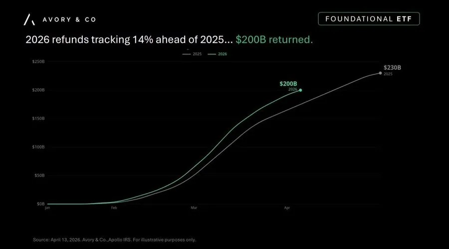 Part of why? Tax refunds. The average refund this season is $3,521 tracking around +14% from last year. About 62.9 million returns processed. That is roughly $200B flowing back into consumer pockets in a compressed window.